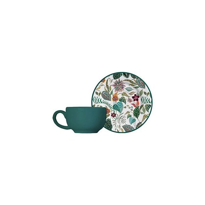 Contém 6 xícaras de café com 85 ml e 6 pires