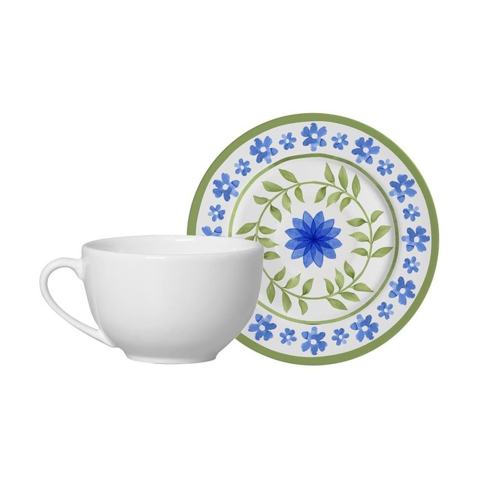 Contendo 6 xícaras de chá de 250 ml com pires.