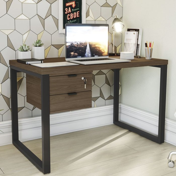 - 01 Mesa para Escritório em estilo industrial F120, medindo 120x70cm, com tampo fabricado em MDP e revestido em BP - o que proporciona alta resistência a riscos e facilidade na limpeza. Possui passa fios acoplado ao tampo, pés em aço e sapatas reguladoras - para nivelar perfeitamente a sua mesa ao piso.