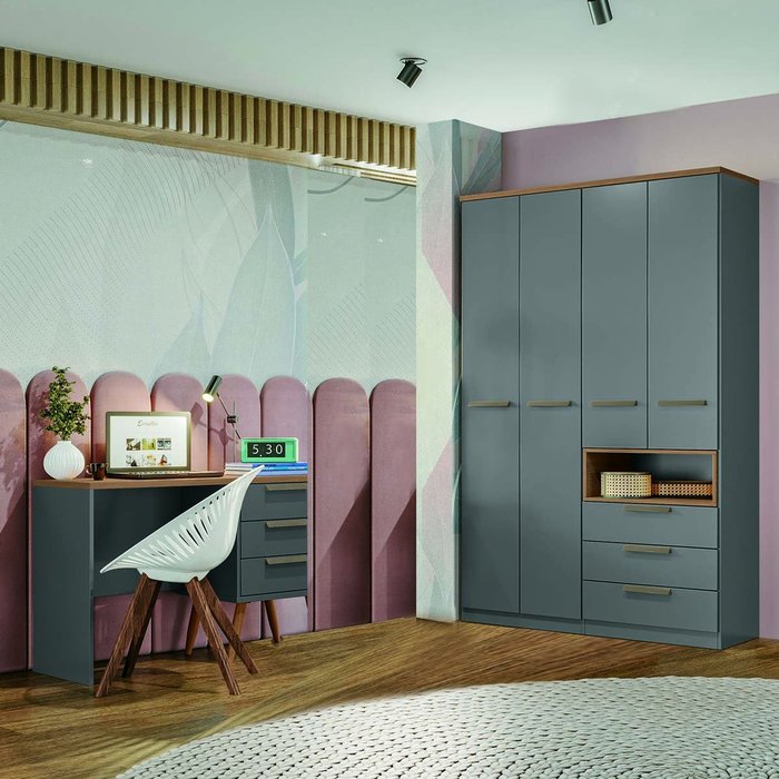 Conjunto Conect Grafite/jatobá Guarda-roupa 4 Portas 3 Gavetas, Escrivaninha 3 Gavetas Tomada Usb em