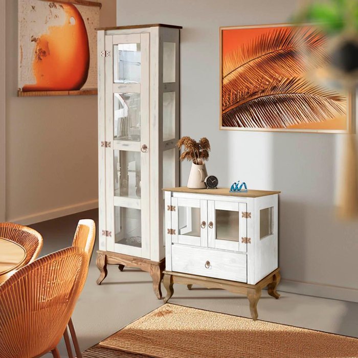 Descubra o conjunto perfeito de Balcão e Cristaleira Rústicos, feito em madeira maciça de Pinus de reflorestamento. Este conjunto oferece durabilidade e sustentabilidade, com vidros de 3 mm e fechos magnéticos nas portas, garantindo segurança e praticidade. A cristaleira conta com uma gaveta espaçosa e corrediças de madeira, proporcionando organização fácil e eficiente. Os vidros laterais adicionam um toque premium, permitindo a visualização dos itens internos. Os pés torneados no estilo Luis XV e os puxadores e dobradiças metálicos estilo mexicano adicionam um toque de elegância clássica e charme artesanal. O acabamento em pintura UV com brilho semi fosco oferece proteção e um visual sofisticado. Este conjunto combina o charme rústico com a elegância atemporal, transformando qualquer ambiente com personalidade e estilo. Madeira maciça em Pinus (madeira de reflorestamento): Durabilidade e compromisso com a sustentabilidade. Conjunto inclui um balcão e uma cristaleira: Perfeito para complementar a decoração da sua casa. Balcão com 2 portas e cristaleira com 1 porta: Equipados com vidros de 3 mm e fechos magnéticos, garantindo praticidade e segurança no armazenamento. Vidros laterais: Adicionam um design premium, permitindo a visualização dos itens internos. Cristaleira com 1 gaveta espaçosa: Corrediças de madeira proporcionam facilidade de uso e amplo espaço para organização. Pés torneados estilo Luis XV: Design clássico que adiciona elegância e sofisticação ao ambiente. Puxadores e dobradiças metálicos estilo mexicano: Detalhes artesanais que conferem charme e autenticidade. Acabamento em pintura UV com brilho semi fosco: Proteção e beleza, com um acabamento sofisticado. Charme rústico: Combina elementos rústicos e elegantes, ideal para trazer personalidade ao ambiente.Dimensões da cristaleira: Largura 47 cm; Profundidade 36 cm; Altura 176 cm.