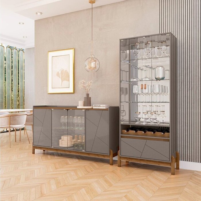 Conjunto Cristaleira Bari e Buffet Bari Cinza Perola / Cedro
