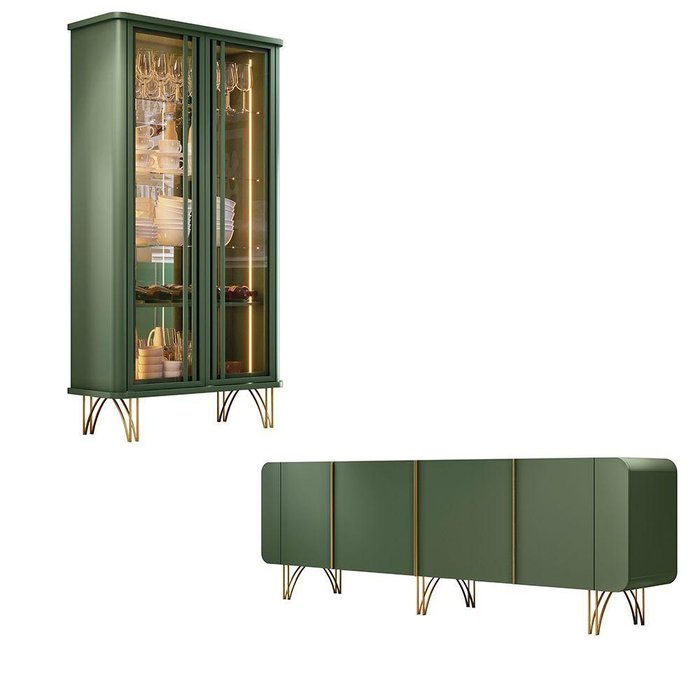 Conjunto Cristaleira Buffet com Led Portas de Vidro Pés Aço Maciço Cor Dourado Texas-virginia Verde Pistache