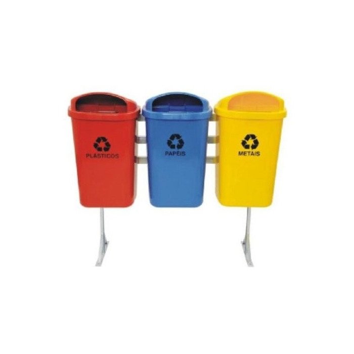 Conjunto de lixeiras para coleta seletiva. Cores: Vermelho - Plásticos, Azul - Papéis e Amarelo - Metais. Características Produzida em polipropileno de alta resistência. Indicada para coleta seletiva de resíduos em área externas. Tampa com abertura frontal que evita entrada de água no coletor, possui chave, superfícies interna polidas e com os cantos arredondados, para maior facilidade na limpeza. Medida de cada cesto Altura: 52 cm Largura: 44 cm Profundidade: 33,2 cm Capacidade: 40 litros Características do suporte Estrutura metálica confeccionada em aço carbono 1020 galvanizada, oferecem excelente durabilidade e facilidade para a descarga do material coletado. Ao abrir a tampa permite a remoção do cesto com facilidade, possui em sua fabricação compostos que protege contra raios UV, podendo ficar exposto ao tempo sem desbotar a cor. Medidas do conjunto aproximadamente Altura: 1,21 metros Largura: 54 cm Comprimento: 1,32 metros Embalagem: 03 lixeiras de 40 litros e 01 suporte.
