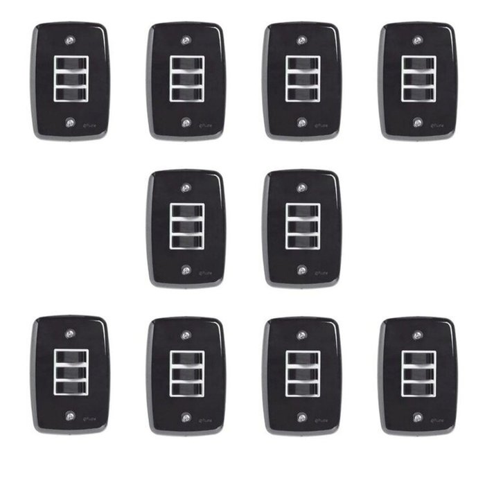 Conjunto de 10 Interruptores de 3 Teclas Simples com Placa 4x2 Preto