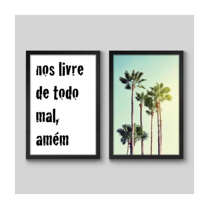 Conjunto de 2 Quadros Frase Nos Livre de Todo Mal Amém e Coqueiros - 2 Quadros 60x40cm - Moldura Pad