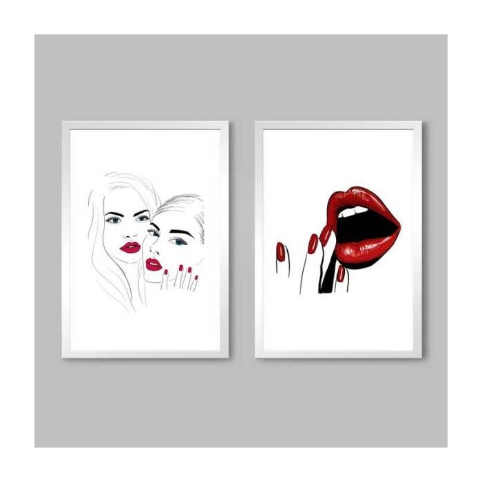 Conjunto de 2 Quadros Sexy Lábios Vermelhos - 2 Quadros 90x60cm - Moldura Caixa Branco