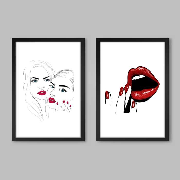 Conjunto de 2 Quadros Sexy Lábios Vermelhos Arts Memphis 2 Quadros 30x20cm Papel Fotográfico Sem Mol
