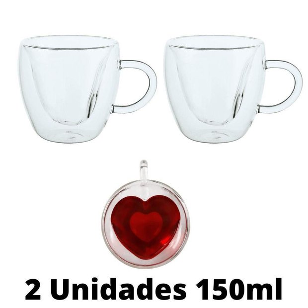 2x Xícara vidro duplo em formato de coração 150ml Garantia