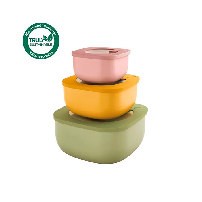 Design facilmente arrumado, empilhável e aninhado Compatível com freezer e geladeira Economia de espaço; formato quadrado para otimizar espaços no freezer, geladeira ou despensa Feito em plástico de base biológica e 100% reciclável