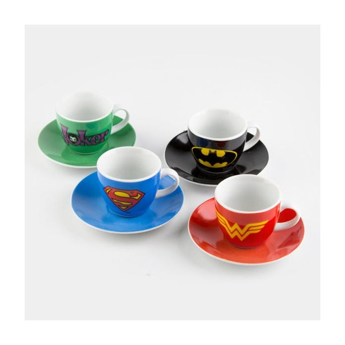 Conjunto de 4 Xícaras DC Comics Logos Um café quentinho pro lanche da tarde é sempre bem vindo, ainda mais quando vem em boa companhia como a dos super heróis da DC Comics. Com esse lindo conjunto de xícaras de 8 peças, sendo 4 xícaras e 4 pires, feito de cerâmica,com os logos do Batman, Mulher Maravilha, Superman e Coringa, com certeza o café vai ficar reforçado. Excelente opção de presente! Dimensões da xícara: 6,3 cm x 4 cm Capacidade: 75 ml Dimensões do pires: 11 cm Material: Cerâmica Conteúdo da embalagem: 4 xícaras e 4 pires Instruções de conservação: Não usar produtos abrasivos. Choques ou quedas podem danificar o produto.