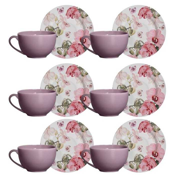 Conjunto de 6 Xícaras de Chá com Pires Encanto Malva - 200ml