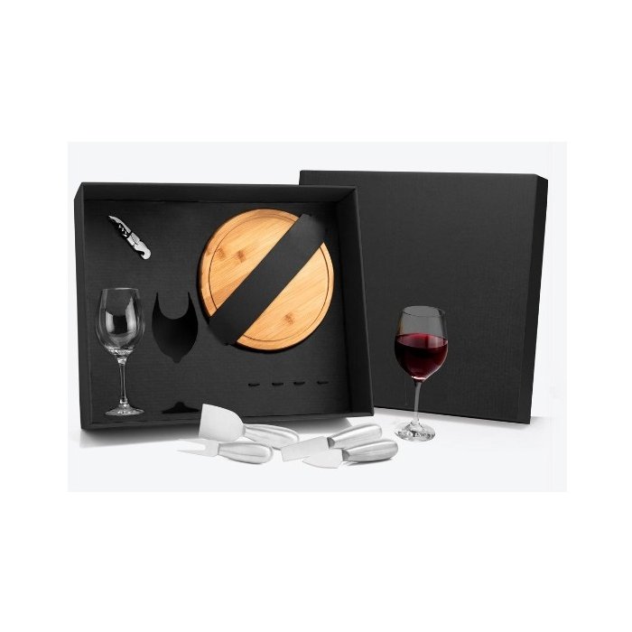 Inclui tábua para cortar queijo e outros petiscos em bambu, garfo, espátula e duas facas, abridor de garrafas e tampão em metal, duas taças para vinho.