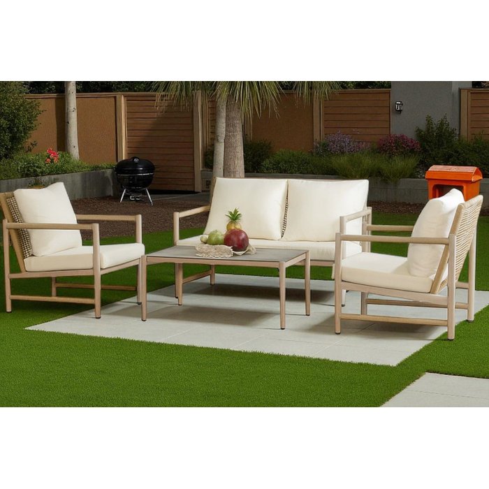 O sofá deste conjunto é um convite ao relaxamento, com sua estrutura confortável e design atraente. As almofadas macias e o acabamento impecável oferecem um espaço acolhedor para descontrair e aproveitar a brisa ao ar livre.