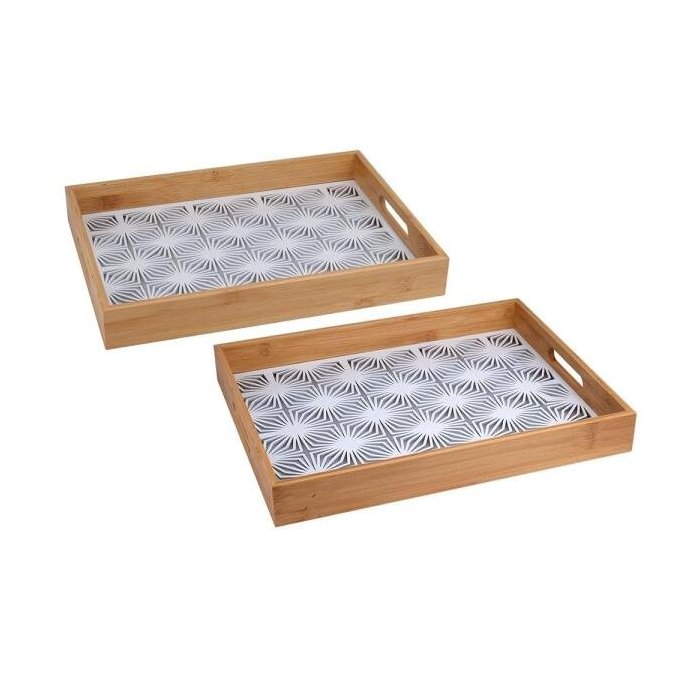 Bandeja de Madeira Natural e Vidro. Bandeja-Bar no aparador X Decore, organize e sirva com belíssimas bandejas! As bandejas deixaram os ármarios da cozinha e invadiram o mundo da decoração: seja como bar, na mesa de centro ou até mesmo no lavabo deixando qualquer cantinho mais bonito e em ordem. As bandejas podem ficar apoiadas em buffets, aparadores, estantes, mesas e até em carrinhos de chá, nas salas de jantar ou estar. E tem espaço para tudo, sejam livros, revistas ,vasos ou adornos, bebidas, taças, toalhas no lavabo, etc, Aposte nas bandejas! Bandeja no lavabo X Quem não gostaria de ter um cantinho para o bar em casa? O problema hoje é que não se dispõem de tanto espaço nos apartamentos e casas, então que tal apostar em uma bandeja bar, que fica linda, moderna e cabe em qualquer cantinho? Escolha uma bandeja de tamanho compatível ao espaço decorado, bebidas e garrafas de sua preferência, taças de diversos tamanhos e incremente com vasos ou baldes de gelo. Bandeja organizando livros e revistas na mesa de centro X Conjunto com 2 peças Cód.: NK0067 Material: Madeira e Vidro Bandeja G: 40x30x5 cm Bandeja P: 35x25x3,5 cm Cor: Natural e estampado Cuidados Por serem de material delicado, a limpeza das bandejas deve ser feita com pano macio, evitando danificar a peça e se necessário detergente neutro com esponja macia. Evite colocar produtos de limpeza diretamente na peça, coloque no pano e aplique sobre a peça. Retire os resíduos com papel toalha ou pano macio que não deixe fiapos. Se a peça ficar exposta, recomendamos a limpeza pelo menos uma vez na semana para evitar acumulo de gordura e poeira.