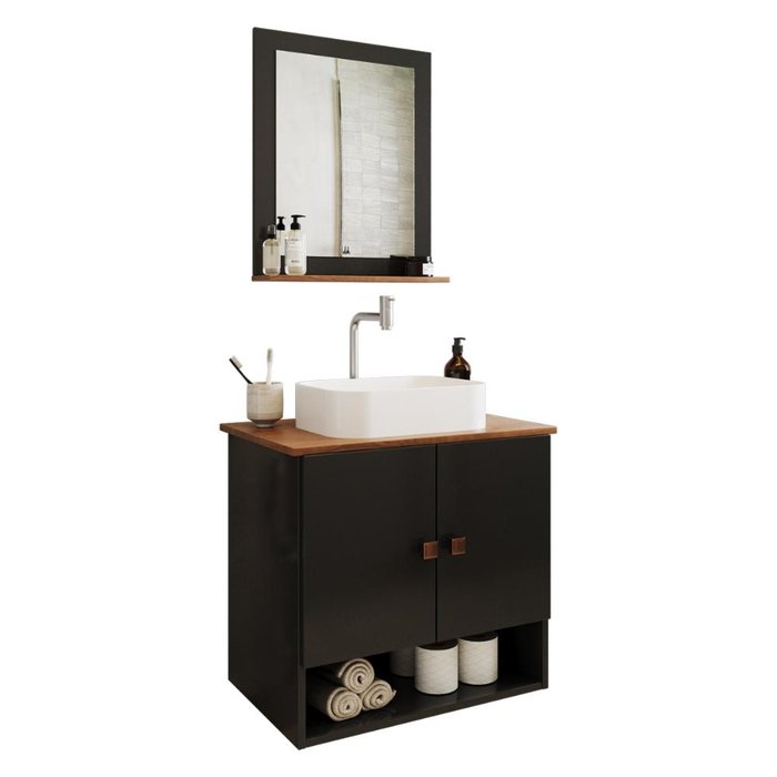 Conjunto de Banheiro com Gabinete 2 Portas, Cuba e 1 Espelheira Deli Preto Fosco/Nature