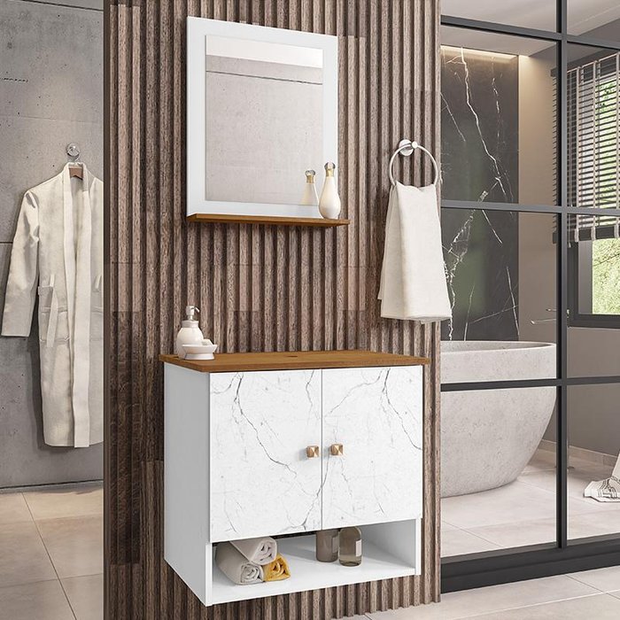 Conjunto de Banheiro com Gabinete 2 Portas e 1 Espelheira Deli Branco Carrara/Nature