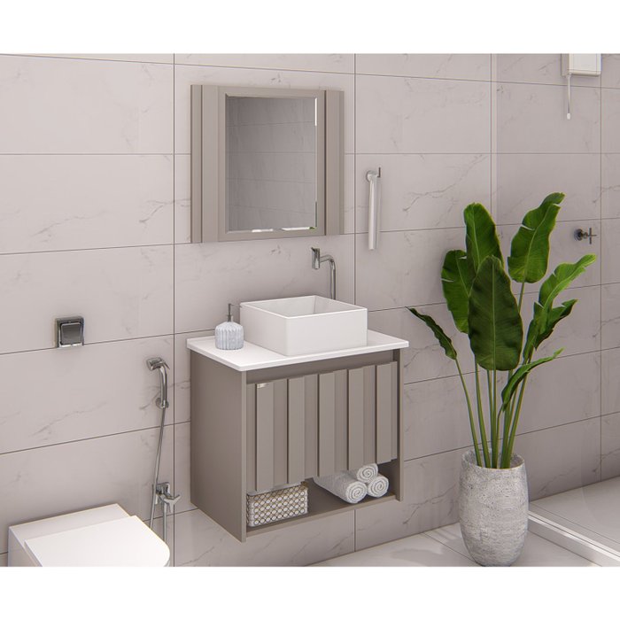 O armário kit Treviso possui composição harmoniosa entre espelheiro e armário, com design estilo ripado que o deixa mais moderno e bonito além de prático, com sua gaveta interna que facilita na organização dos objetos, nicho inferior com ótimo espaço interno e porta de bascular com pistão a gás para uma abertura suave. Sua estrutura é 100% em MDP – BP amadeirado ou texturizado, e possui várias opções de tampo e cuba de sobrepor se adequando a todos os tipos de ambientes, e ao gosto do cliente.