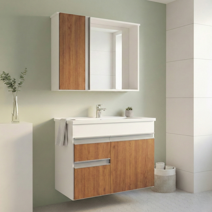 Organização Inteligente: Possui duas gavetas com corrediças telescópicas, que garantem abertura suave e acesso total aos itens, além de uma porta com excelente espaço interno para armazenar toalhas e produtos maiores.