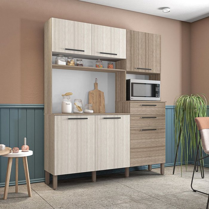 A Cozinha montesa é produzida com madeira reconstituída, MDP de 12 mm, provindo de reservas florestais para este fim, respeitando o meio ambiente. Possui seis portas, duas amplas gavetas, nas portas e gavetas são utilizados dobradiças e corrediças 100 metálicas. Os puxadores são em plástico resistente com acabamento metalizado, verniz UV e ponteiras cromadas, que proporciona maior durabilidade. Conta com nicho para pequenos objetos, além disso, tem nicho para micro-ondas e passa fio no traseiro facilitando o acesso a tomada na parede. O espaço interno é bem dividido com a utilização de prateleiras, para melhor organizar os utensílios da cozinha.