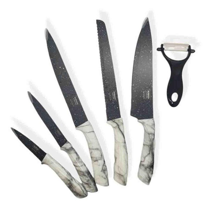 Jogo de Facas Marmorizadas Chef 6 Peças XDX Inox Com foco na inovação e tecnologia no ramo do Inox, a XDX possui uma linha de panelas industriais, domésticas, talheres e utensílios gerais. Garantindo resistência e durabilidade, classe, sofisticação, funcionalidade e design Com toda praticidade e requinte para nossos clientes, apresentamos nosso Kit de Facas Marmorizadas Chef 6 peças XDX Inox, fizemos um excelente acabamento em brilho para você deixar exposta em sua mesa, nos almoços e jantares, podendo também ser usadas em restaurantes, buffets, padarias Feitas de aço inoxidável, possui uma resistência superior aos outros materiais comumente usados na fabricação de utensílios, facilidade de limpeza, sofisticação visual com design diferenciado, além da alta durabilidade e vida útil. Kit: Faca do Chef: 17,8 cm de altura e 5cm de largura Faca de Pão: 20cm de altura e 4,5 cm de largura Fileteira: 20cm de altura e 3 cm de largura Faca de Legumes: 9cm de altura e 2,5 de largura Descascador: 13 cm de altura e 5,5cm de largura