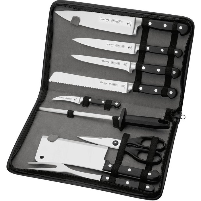 Descobrir novas receitas, preparar os alimentos da melhor forma e com os melhores instrumentos é parte da inspiração dos artistas. E, para tornar esta realidade uma arte, a Tramontina desenvolve seus utensílios com o que há de mais moderno, levando precisão, qualidade e beleza à sua cozinha. Uma linha completa para atender chefs, gourmets e aficcionados pela cozinha. Características: - Laminas em aço inox trazem qualidade e durabilidade ao jogo - Cabos de policarbonato com fibra de vidro trazem durabilidade e conforto ao uso - O estojo sintético traz proteção as peças do conjutn - O conjunto é tudo que sua cozinha precisa - Pode ser levado a lava-louça, assim facilita seu dia-dia - 25 anos de garantia - Cor do estojo e dos produtos são preto - A linha century traz uma qualidade acima da media do mercado e o melhor de tudo é que o preço cabe em seu bolso. Sendo um jogo de Facas completos que traz facas para desossar, pão, cozinha, a faca do chef, cutelo, garfo trichante, tesoura multiuso e chaira para deixar sempre os utensílios afiados. Garanta agora mesmo o seu produto e conheça a linha de alta qualidade da Tramontina, onde os produtos são produzido pensados nos mais pequenos detalhes, sempre prezando a qualidade e o conforto de quem utiliza. Mas lembre-se, está oferta é por tempo limitado