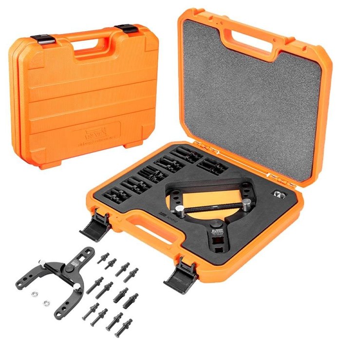 Conjunto de Ferramentas Para Retenção da Polia 101019 RAVEN Conjunto de ferramentas para travar polias de árvores de comando, árvores de manivelas e periféricos de motores ciclo Otto e Diesel de automóveis e utilitários. Também indicado para travar flanges de caixas de transmissão e diferenciais de automóveis e utilitários com tração traseira / integral. Possui garfo ajustável grande e robusto, além de 6 pares de pinos com diâmetros e formatos variados, sendo 5 pares de pinos para travar diretamente as polias / flanges (apoiando o garfo nos orifícios, aberturas ou outros pontos de apoio) e 1 par com rasgo central, para travar polias através de uma correia dentada ou poly-v usada ao redor da polia (ideal para travar polias que não possuem aberturas ou pontos de apoio). Produto fornecido em uma maleta plástica especial grande. Composição 01 Garfo grande, de construção robusta, com encaixes de 1/2" e 3/4", abertura ajustável através de um fuso (com encaixe sextavado em uma das extremidades) e 6 orifícios, sendo 2 para encaixe dos pinos fornecidos e 4 adicionais (para travar polias / flanges através de parafusos e porcas, por exemplo) (101019-00B);02 Pinos com diâmetro de 7mm, comprimento de 22mm, encaixe especial e rosca (101019-00C);02 Pinos com diâmetro de 10mm, comprimento de 30mm, encaixe especial e rosca (101019-00D);02 Pinos com diâmetro de 10mm, comprimento de 40mm, encaixe especial e rosca (101019-00E);02 Pinos com diâmetro de 12mm na extremidade e diâmetro de 8mm no comprimento, comprimento de 30mm, encaixe especial e rosca (101019-00F);02 Pinos com diâmetro de 14mm na extremidade e diâmetro de 10mm no comprimento, comprimento de 30mm, encaixe especial e rosca (101019-00G);02 Pinos com diâmetro de 14mm, comprimento de 30mm, rasgo central com 28mm de profundidade (para travar polias através de correias dentadas ou poly-v usadas), encaixe especial e rosca (101019-00H);02 par de porcas M10x1,5mm (PRT5064). Peso: 3,44kg Garantia: 3 mesesReferência: 101019 Marca: RAVEN * Imagens meramente ilustrativas