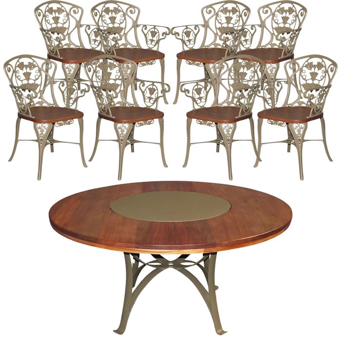 Acompanhando a mesa, estão 6 cadeiras de alumínio fundido, no elegante modelo Malbec. Essas cadeiras, além de robustas e resistentes, possuem um design sofisticado, com assentos em madeira que proporcionam conforto e um visual rústico-chique, ideal tanto para ambientes internos quanto externos cobertos.