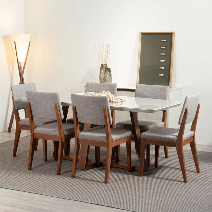Conjunto de Jantar Mesa com Vidro Bennett 6 Cadeiras Ella - Natural C/ Mescla Cinza