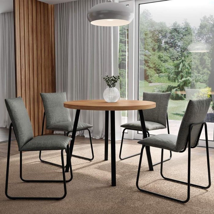 A versão da Mesa de Jantar Stellar Redonda + 4 Cadeiras, sendo perfeita para ambientes compactos, une funcionalidade e beleza em um só lugar. O acabamento em amadeirado e os complementos em tubo de aço conferem uma sensação de aconchego ao ambiente.