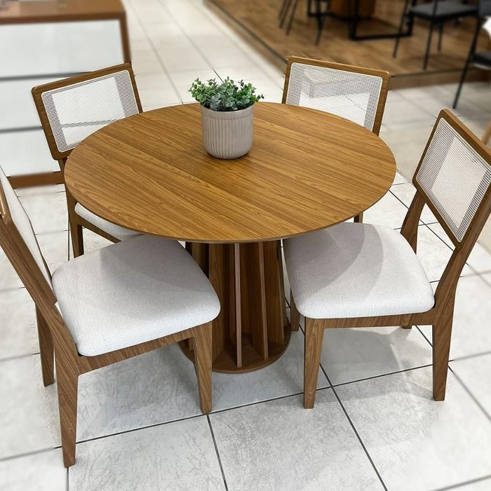 Conjunto de Jantar Mesa Redonda Mdf e 4 Cadeiras Tela Palha
