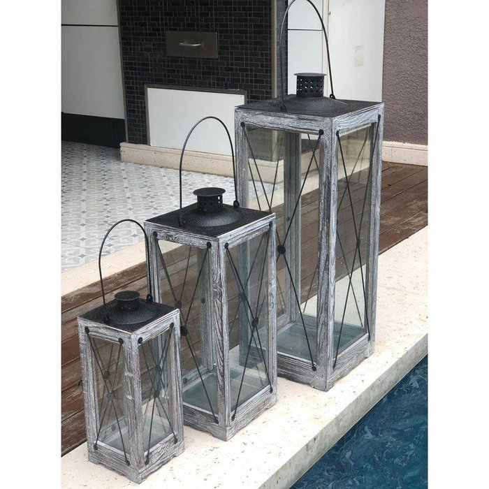 Conjunto De Lanternas De Madeira Com Patina Envelhecida