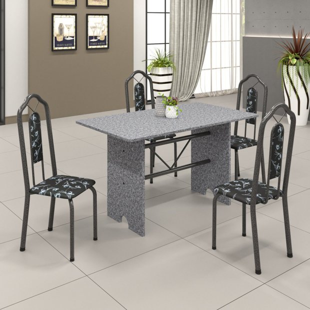 Conjunto de Mesa 120x75cm Tampo Granito com 4 Cadeiras Bianca Martelado Prata/Granito Ocre/Preto Floral