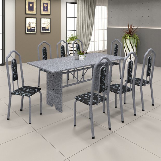 Conjunto de Mesa 180x75cm Tampo Granito com 8 Cadeiras Bianca Martelado Pérola/Ocre/Preto Floral
