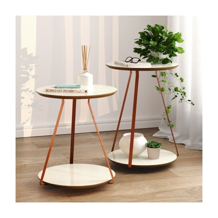 Conjunto de Mesa Apoio Lateral Redonda Sofia Pés Ferro Cobre Off White/Freijo