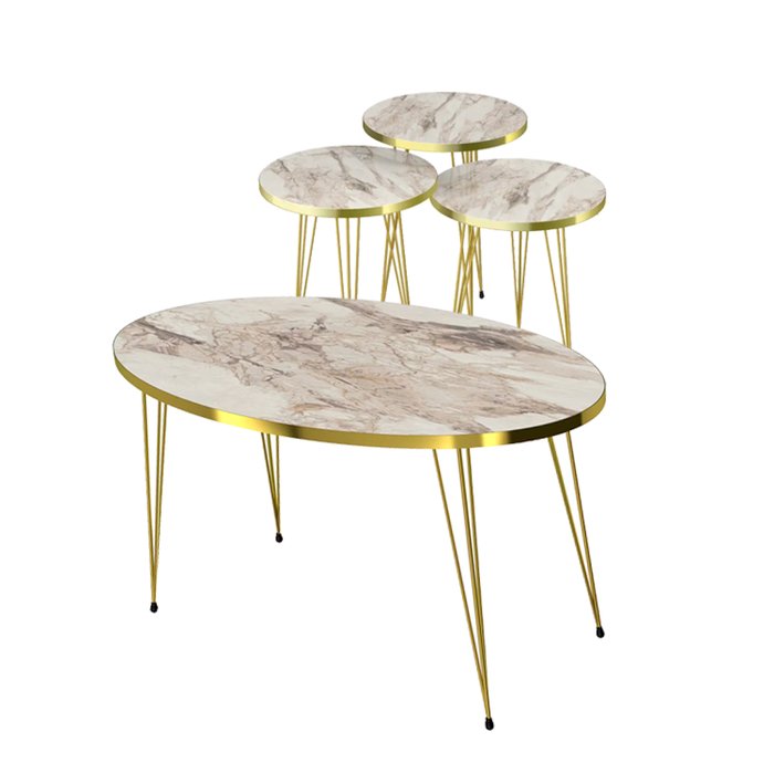 Conjunto de mesa de centro com 4 peças de tamanhos e alturas diferentes na cor mármore branco Conjunto de mesas de centroEste conjunto de mesas é versátil e adapta-se perfeitamente à sua sala de estar, por exemplo, e permite-lhe poupar espaço, pois encaixam umas nas outras. As mesas de centro são uma peça essencial de mobiliário em qualquer sala de estar, servindo como uma superfície funcional e decorativa para guardar bebidas e outros itens. Mesa de apoio ideal para as suas jarras, vasos de flores e muito mais. O conjunto de mesas de encaixe é uma opção de economia de espaço para móveis de casa ou escritório. Elas são versáteis e podem ser usados em uma variedade de configurações, de salas de estar a escritórios. Elas são uma ótima opção para maximizar metragem quadrada e para usar quando necessário e armazenar quando não for necessário. Conjunto composto por uma mesa oval e 3 mesas redondas.Material:- Tampo: MDP- Pernas: metalDimensões: (largura x comprimento)- Mesa Oval (largura x comprimento x altura): 50 x 90 x 43cm- Mesa redonda n.º 1 (largura x altura): 34 x 47cm- Mesa redonda n.º 2(largura x altura): 34 x 50cm- Mesa redonda n.º 3(largura x altura): 34 x 55 cmCor:- Tampo: mármore branco - Pernas: douradoConteúdo da embalagem: 1 conjunto de 4 mesas de centro (tamanhos diferentes)Observação: Produto não vai montado e não nos responsabilizamos pela montagem.