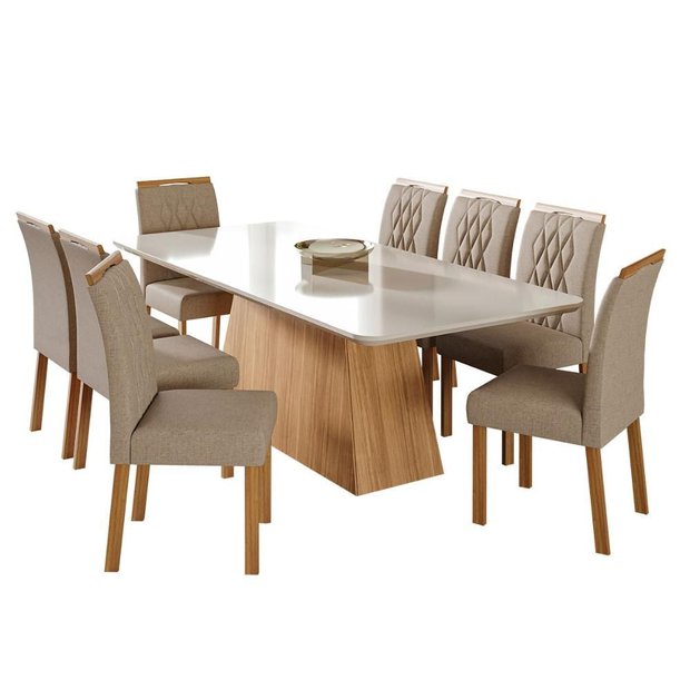 Sala de jantar Helena de 2,10x1,0 com 8 cadeiras Juliana. Que tal reunir a sua família para um jantar? Nesse momento a Cimol vai está presente, proporcionando situações agradáveis e descontraídas! A mesa Helena possui uma base em formato triangular, seu tampo é em mdf/vidro com bordas chanfradas e acabamento em laca. Já as cadeiras Juliana são uma ótima opção pois a sua estrutura é toda em madeira tauari com pintura em verniz, o assento e encosto possui espumas de alta densidade proporcionando maior conforto. Com um design inovador, a Cimol busca sempre um estilo moderno para o seu ambiente!Atenção !Por favor, leia atentamente todas as informações disponíveis sobre o produto antes de efetuar a compra para garantir que atenda às suas necessidades e expectativas.*Prédio: Por favor, confira as dimensões do produto e certifique-se de que estão adequadas aos elevadores, portas e corredores do local da entrega, pois não fazemos a montagem, desmontagem do produto e/ou portas e janelas, transporte pela escada ou içamento pelo lado de fora do prédio.*Condomínio: Se a portaria do condomínio permitir, as entregas são efetuadas no piso térreo e é de responsabilidade do cliente a locomoção da mercadoria até seu apartamento ou casa.TransportadoraÉ vedado à transportadora:- entrar no domicílio;