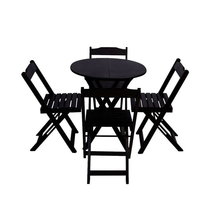 Conjunto de Mesa Dobravel Com 4 Cadeiras Tampo Redondo 70x70 Preto É ideal para bares, restaurantes, estabelecimentos, áreas de lazer e tambem para sua casa. Feito em madeira maciça, tornando resistentes e duráveis. Seu design permite que seja encaixado em qualquer ambiente, trazendo um toque a mais para seu estabelecimento. Além de sua durabilidade, o que lhe trará conforto para servir seus clientes. Por ser dobrável torna-se mais fácil guardar, manusear e limpar o produto. Atenção: EVITE USAR PRODUTOS ABRASIVOS E QUÍMICOS PARA LIMPEZA DO PRODUTO, aconselha-se o uso de pano umedecido para melhor conservação; mantenha o produto fora de chuva e sol constantes