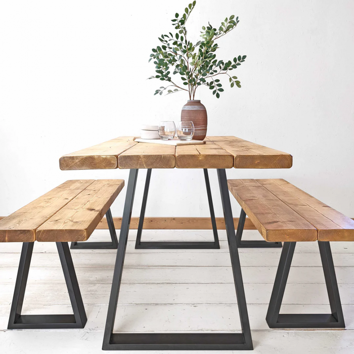 Conjunto de Mesa e Bancos Rústicos | Estrutura Trapézio - 200cm