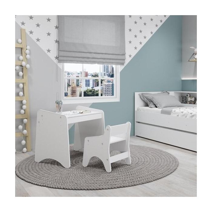 O conjunto de mesa e cadeirinha, além de ser um charme, pode ser utilizado em vários lugares da casa. A cadeirinha possui encosto, seu formato arredondado proporciona conforto e segurança e suporta até 50 kg. Resistente e funcional, a mesa foi desenvolvida para ser um local de atividades, onde a criança pode fazer o lanche, desenhar, pintar e brincar. Possui uma gaveta com divisões que auxilia na organização dos materiais. A mesa possui regulagem de altura, podendo ser utilizada por crianças de diferentes idades.