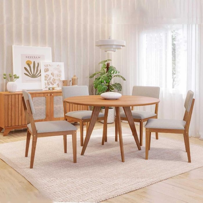 Conjunto Sala de Jantar Acerola Redonda 1,09 Sem Vidro com 4 Cadeiras Sabiá Madeira/Cinamomo/Linho CinzaA Mesa Acerola entrega equilíbrio entre forma, função e estética. Com design redondo e estrutura robusta em Madeira Maciça, é ideal para ambientes acolhedores e funcionais. Composta por Tampo de MDF de alta qualidade, a mesa oferece durabilidade e resistência para o uso diário. As cadeiras Sabiá trazem conforto e sofisticação, com acabamento cuidadoso que valoriza qualquer espaço.Atenção! Antes de efetuar a compra, leia atentamente todas as informações sobre o produto para garantir que ele atende às suas necessidades e expectativas. Verifique as dimensões e certifique-se de que o item pode ser transportado sem dificuldades até o local desejado. É essencial conferir se as medidas são compatíveis com elevadores, portas e corredores do prédio, pois não realizamos montagem ou desmontagem do produto, remoção de portas e janelas, transporte por escadas ou içamento pelo lado externo do edifício. Para entregas em condomínios, caso a portaria permita, a mercadoria será deixada no térreo, ficando sob responsabilidade do cliente transportá-la até seu apartamento ou casa. A transportadora não está autorizada a entrar no domicílio, fazer entregas por meios alternativos, como içamento pela janela, subir escadas, instalar ou realizar manutenção do produto, abrir embalagens, coletar devoluções, entregar em endereço diferente do informado na Nota Fiscal (DANFE) ou realizar a entrega a menores de idade ou pessoas sem identificação. Certifique-se de que todas as condições de entrega estão adequadas antes de finalizar a compra, evitando transtornos no recebimento do seu pedido. Em caso de dúvidas, entre em contato conosco.Ficha técnica do Produto
