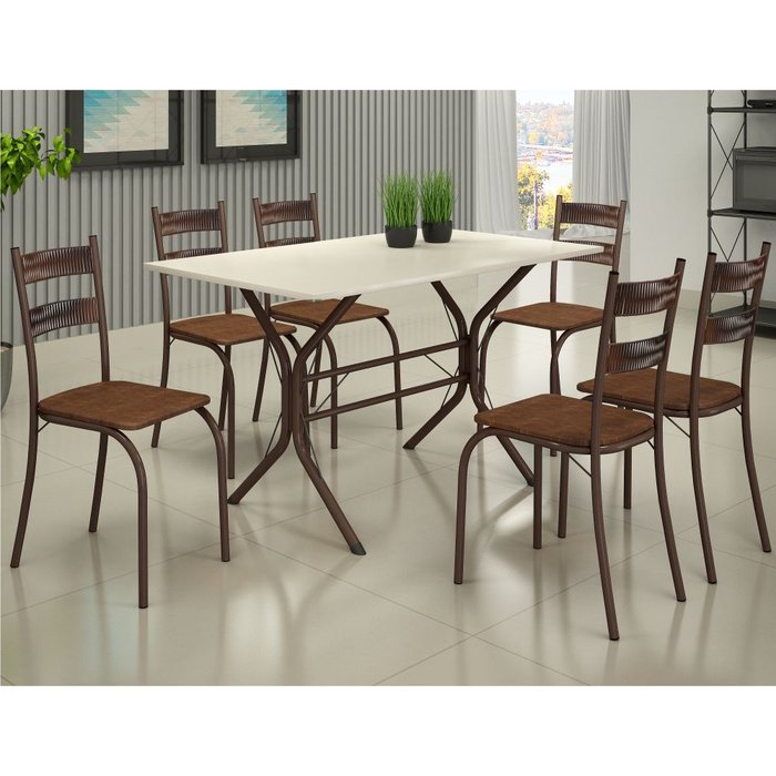 Conjunto de Mesa Teixeira Macaé Cabo Frio com 6 cadeiras com encosto em Ratam tampo em pedra Marrom Marrom/OFF White