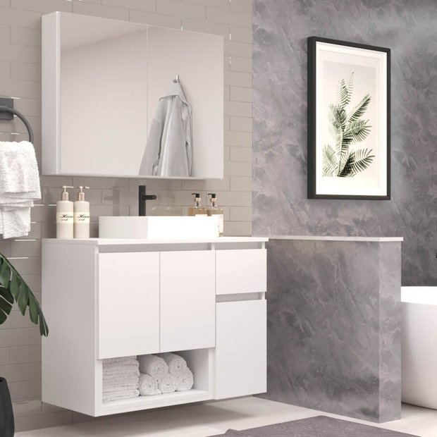 Design e Organização: O gabinete suspenso conta com três portas, uma gaveta externa e um nicho lateral, oferecendo compartimentos variados para armazenar desde toalhas até pequenos acessórios.