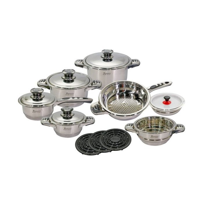 Com um dos mais resistentes metais utilizados em produtos de consumo. Resistente à fragmentação, fissuras e arranhões. Os alimentos aquecem rapidamente e retém o calor. O fundo tem sete camadas em aço cirúrgico que proporcionam o aquecimento uniforme dos alimentos, mantém aquecido por mais tempo após servido à mesa, além de aumentar a vida útil do produto por vários anos. As tampas possuem indicador de controle de temperatura (Termostato) que indicam se o interior da panela está com pouco calor, calor moderado ou extremamente quente. Isso facilita o preparo adequado dos mais variados tipos de alimentos e, serve para cozinhar em cozinhas a: 1. Gás. 2. Elétrica. 3. Electromecânico. 4. Halogêneo.Fácil de limpar (gorduras e alimentos não se acumulam). Cuidados especiais: É muito importante lavar nossos produtos antes do primeiro uso, para remover qualquer resíduo de óleo ou substância de polir usada no processo de fabricação. Se não lavarmos, o produto pode ficar com manchas e ter a coloração prejudicada. 1-Lave cada utensílio com água quente em abundância e sabão juntando um quarto de copo americano de vinagre. Use esponja macia ou pano. 2-Em seguida enxágue cuidadosamente com água quente e seque para prevenir manchas de água. Aço inoxidável cirurgico pode riscar se manuseado de forma inadequada. Os riscos não interferem no desempenho da panela Reality, portanto não serão considerados defeitos de fabricação. Para evitá-los: (1) Facas ou utensílios pontiagudos não devem ser usados para cortar, mexer ou servir alimentos. (2) Não use mixer elétrico em sua panela de Aço Inox Cirurgico Reality. (3) Sempre guarde seus utensílios de maneira apropriada, empilhados um dentro do outro quando possível. O produto também pode ser lavado em lava-louças. 1- Para evitar ranhuras e riscos, coloque cada utensílio cuidadosamente para que não atinja outro utensílio ou objeto situado na máquina. 2-As manchas de água podem acontecer. Para evitar use o produto apropriado no processo de lavagem conforme instrução do fabricante. A melhor forma de limpar as panelas Reality: Para manter o aspecto atraente e a eficiência de seu produto é importante que o limpe bem após cada uso. Os resíduos de alimentos que permanecem no interior dos utensílios causam descoloração quando voltam a aquecer. Não permita que as gorduras e sais permaneçam no utensílio por muito tempo. Já com a panela resfriada, use água quente, sabão neutro e uma esponja ou pano de limpeza macios. Quando lavar o utensílio, use uma esponja ou pano macio. Uma limpeza rotineira proporcionará muitos anos de vida aos produtos. A caixa contém os seguintes produtos: 1 panela com tampa de 24 x 13.5 cm 1 panela com tampa de 20 x 11 cm 1 panela com tampa de 16 x 8 cm 1 frigideira com tampa de 24 x 6,5 cm 1 caçarola com tampa de 16 x 8 cm 1 vaporizador de 20 x 10 cm 1 chupão 1 recipiente em aço cirúrgico 20 x 10 cm com tampa de plástico 3 grades de suporte para panela. Produto Importado e de origem Alemã sendo toda documentação, manuais e certificados escritos em língua estrangeira. Conjunto com 17 Peças em Aço Cirúrgico com 7 camadas.