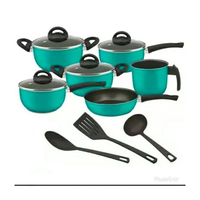 Conjunto de panelas antiaderente 9 peças verde com tampa de vidro e utensílios Trofa