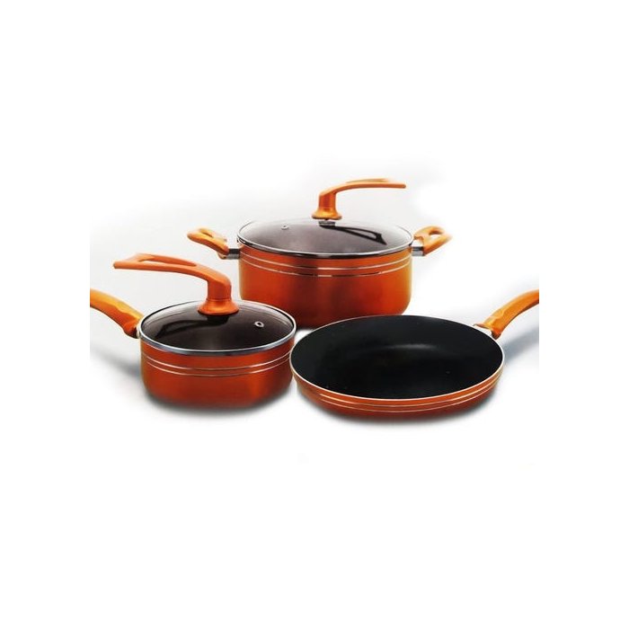 KIT 3 PANELAS FRIGIDEIRAS ANTI ADERENTE TAMPA DE VIDRO- Fácil de limpar.- Beleza e praticidade na cozinha.- Adquira agora mesmo o seu conjunto e prepare deliciosas refeições.- Panelas antiaderente e reduz o uso do óleo, deixando as refeições ainda mais saudáveis.- Panelas feita de alumínio com revestimento cerâmico, permite que os alimentos sejam cozidos de forma uniforme, por dentro e por fora.ESPECIFICAÇÕES;- Cor: Cobre- Material: Alumínio / Aço inoxidável / MadeiraDIMENSÕES:- Panela: 24x10cm (DxA)- Frigideira: 24x5cm (DxA)- Panela Menor: 16x8cm (DxA)- Comprimento dos cabos: 15cm / 18cm;- Capacidade da Panela Maior: 2,2l.ITENS INCLUSOS:- 03 Panelas Conjunto Anti Aderente Alumínio;- 02 Tampas de Vidro;- 03 Cabos;