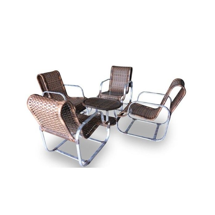 A estrutura de alumínio galvanizado envolto em fibra sintética garante a qualidade de nossos produtos. Conjunto composto por: 4 cadeiras Dimensões A91 x L59 x C96 cm 1 Mesa de centro oval Dimensões A45 x L50 x C71 cm Por se tratar de confecção artesanal, as dimensões dos produtos podem sofrer variação. Cuidados na manutenção do seu móvel Material de fibra sintética é ideal para utilização em ambientes externos, necessitando apenas de pequenos cuidados para que seu móvel mantenha sua aparência como novo. O ideal é limpar as peças semanalmente, usando uma escova com cerdas macias molhada em uma mistura de água com sabão neutro ou pano úmido. Na sequência, deixe os móveis secarem naturalmente à sombra. Durante a higienização de sintéticos, respeite também o sentido das fibras e nunca aplique força demasiada para não comprometer a superfície do trançado. Nunca utilizar lavadoras de pressão sobre as fibras. Garantia Este móvel tem garantia de quatro (04) meses, se usado em condições normais, contra defeitos de fabricação. Essa garantia não cobre defeitos causados por uso inadequado ou abusivo, falta de cuidados, desbotamento natural dos tecidos ou riscos decorrentes do uso.