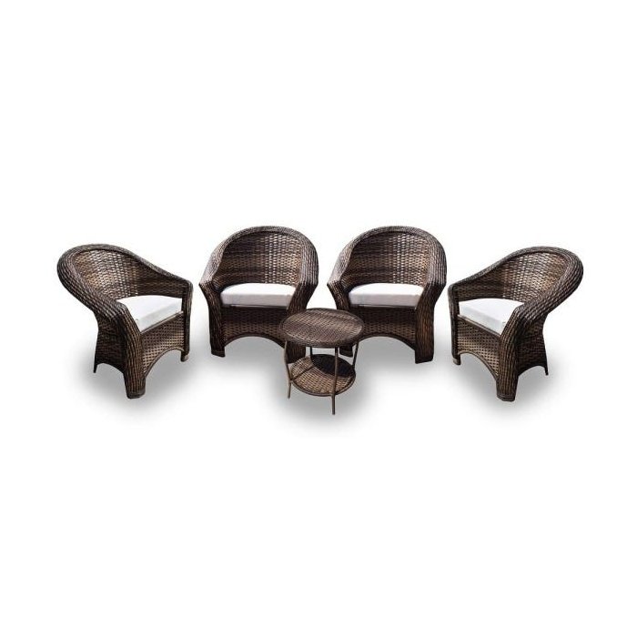A estrutura de aço galvanizado envolto em fibra sintética garante a qualidade de nossos produtos. Nossas almofadas são revestidas com tecidos Acquablock, compostos por 72% algodão e 28% poliéster, com acabamento impermeável. Confira os tecidos disponíveis e todas as vantagens Acquablock aqui. Conjunto composto por: 4 poltronas - Altura do assento com almofada 48 cm Dimensões A87 x L75 x C70 cm 1 Mesa de centro redonda Dimensões A46 x D51 cm Por se tratar de confecção artesanal, as dimensões dos produtos podem sofrer variação. Cuidados na manutenção do seu móvel Material de fibra sintética é ideal para utilização em ambientes externos, necessitando apenas de pequenos cuidados para que seu móvel mantenha sua aparência como novo. O ideal é limpar as peças semanalmente, usando uma escova com cerdas macias molhada em uma mistura de água com sabão neutro ou pano úmido. Na sequência, deixe os móveis secarem naturalmente à sombra. Durante a higienização de sintéticos, respeite também o sentido das fibras e nunca aplique força demasiada para não comprometer a superfície do trançado. Nunca utilizar lavadoras de pressão sobre as fibras. As almofadas de assento e encosto são em tecido impermeável, que bloqueia líquidos, poeiras e fungos, não sendo aconselhável a permanência de estofados em ambiente externo, expostos a intempéries climáticas (chuva). Garantia Este móvel tem garantia de quatro (04) meses, se usado em condições normais, contra defeitos de fabricação. Essa garantia não cobre defeitos causados por uso inadequado ou abusivo, falta de cuidados, desbotamento natural dos tecidos ou riscos decorrentes do uso.