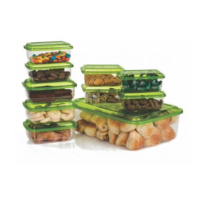 O Conjunto de potes diversos vem em tamanhos pequeno e grande no formato retangular.