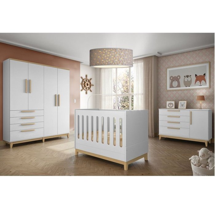 Conjunto de Quarto para Bebê 1 Berço 1 Cômoda 1 Guarda Roupa Aquarela Incabrás Branco/Natural